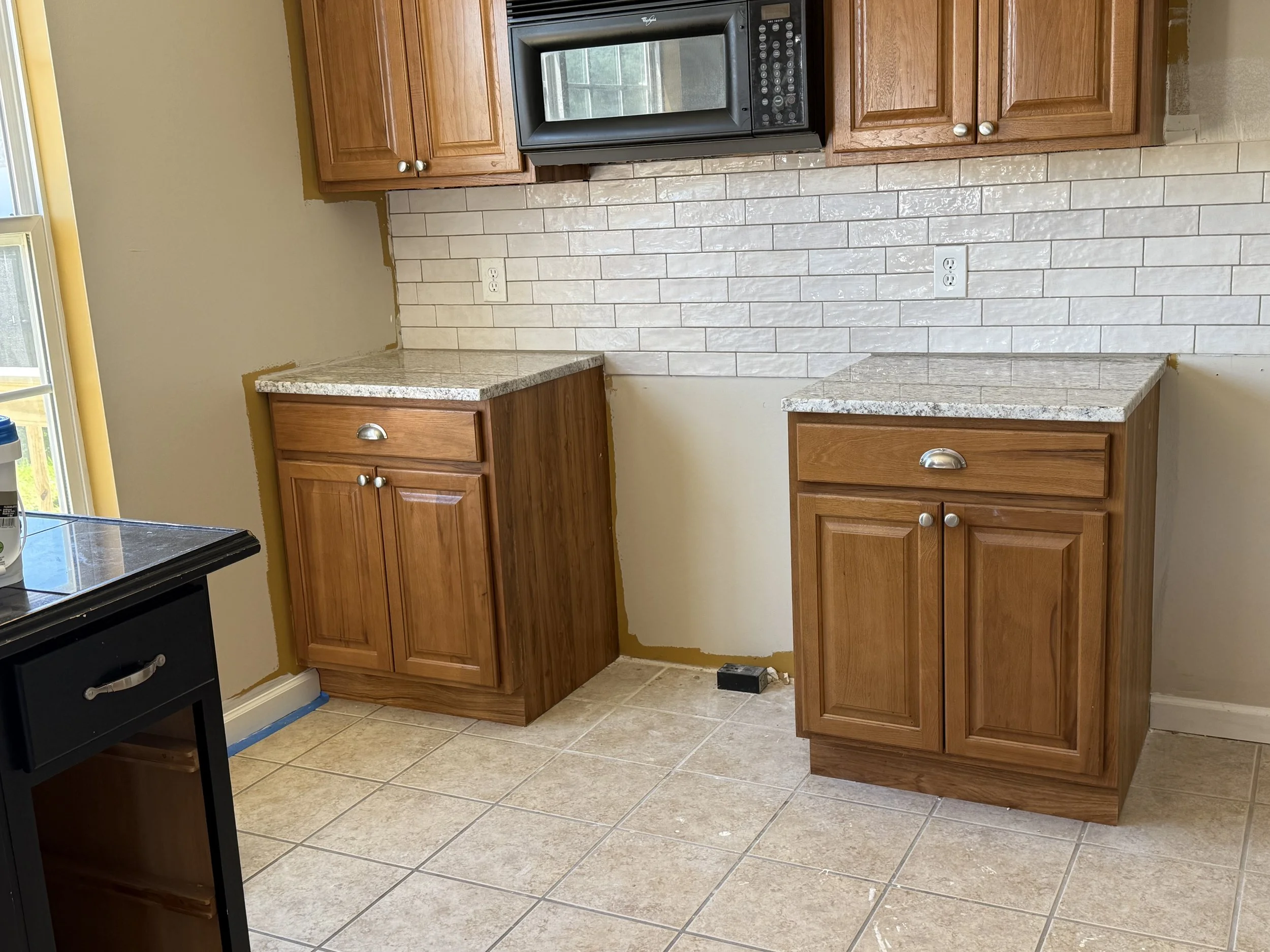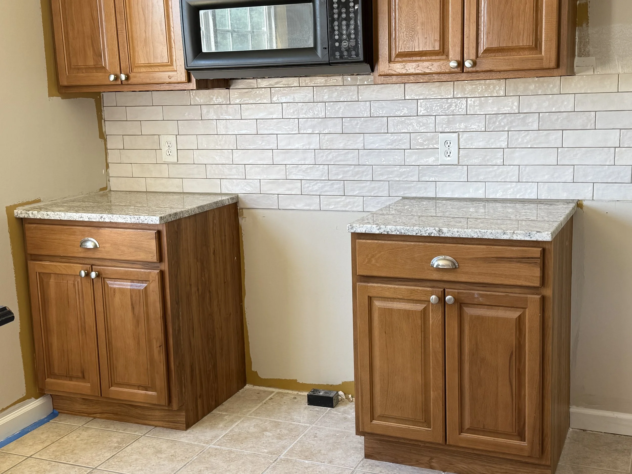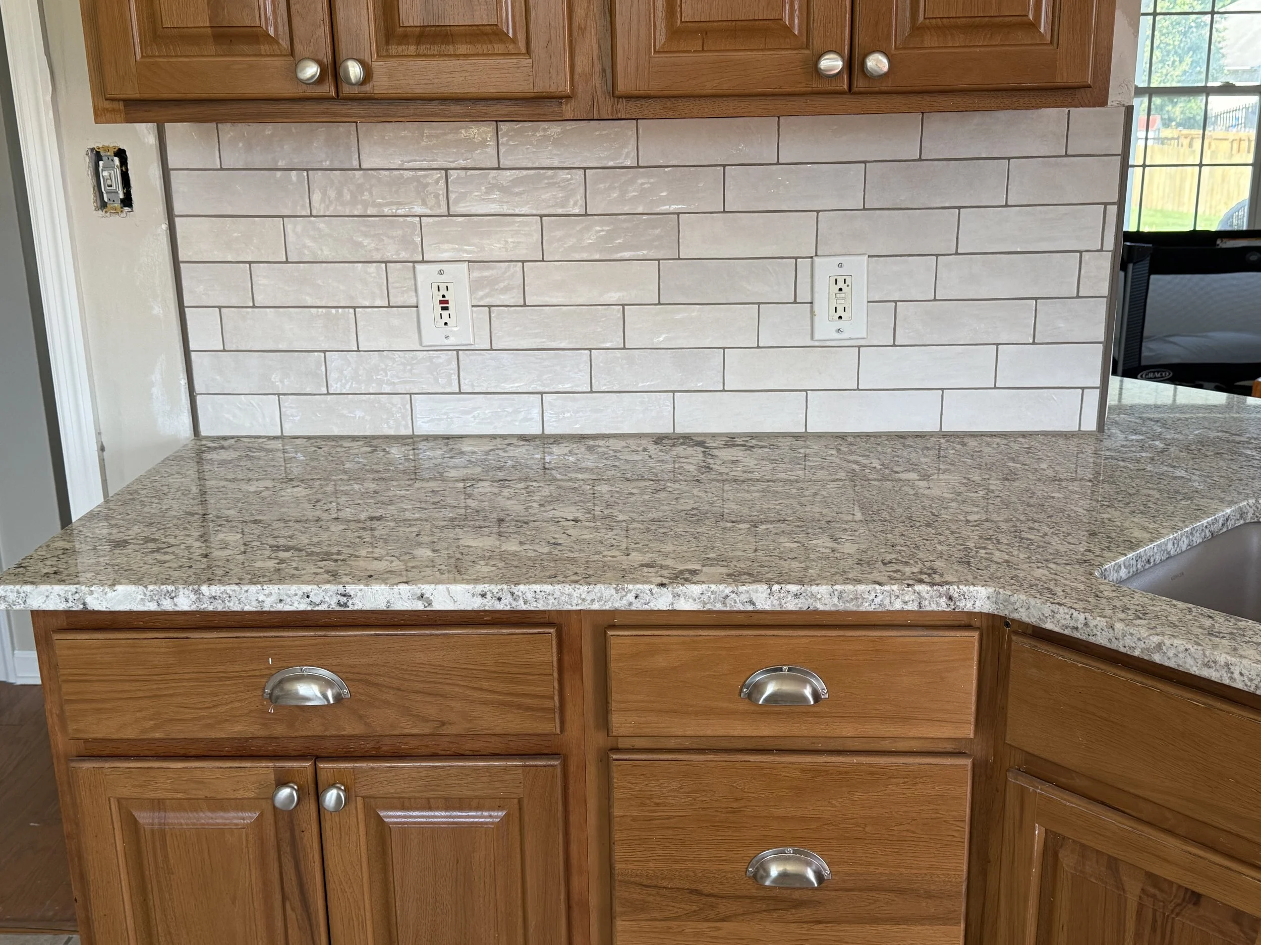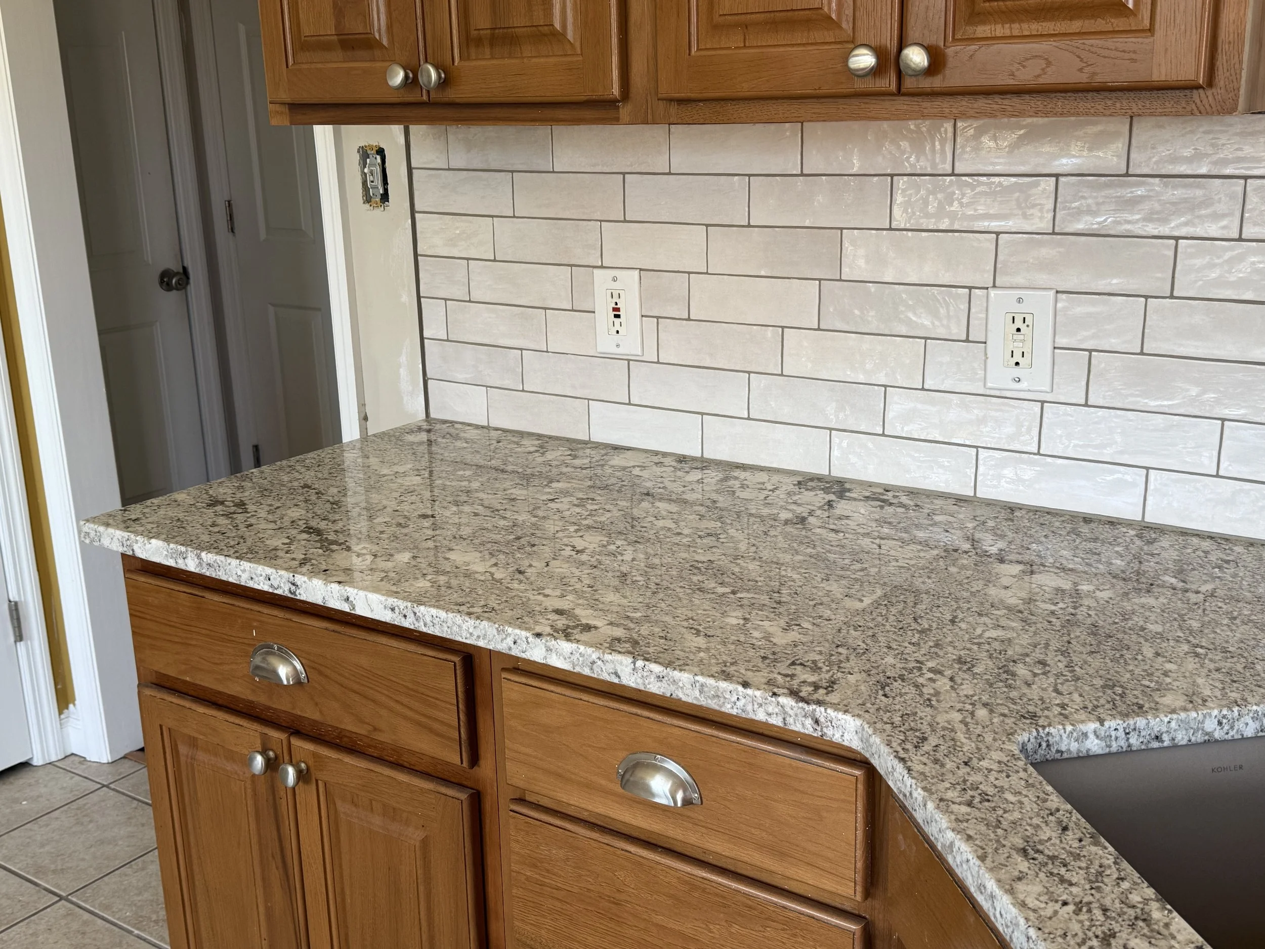 Installed a glossy subway-style backsplash to brighten and modernize the kitchen. Clean lines, precise cuts, and seamless outlet integration create a polished finish that complements the wood cabinetry and granite countertops.