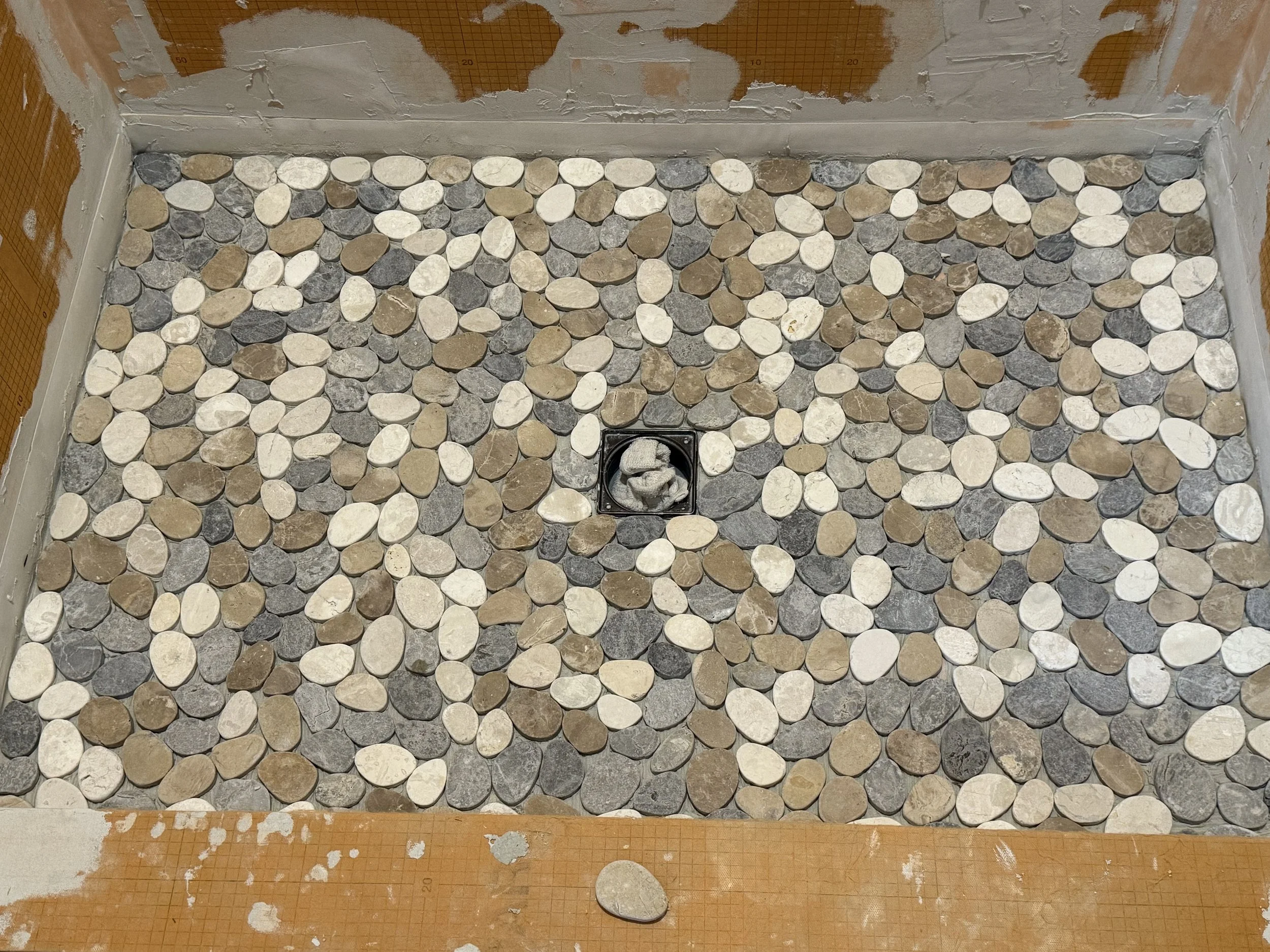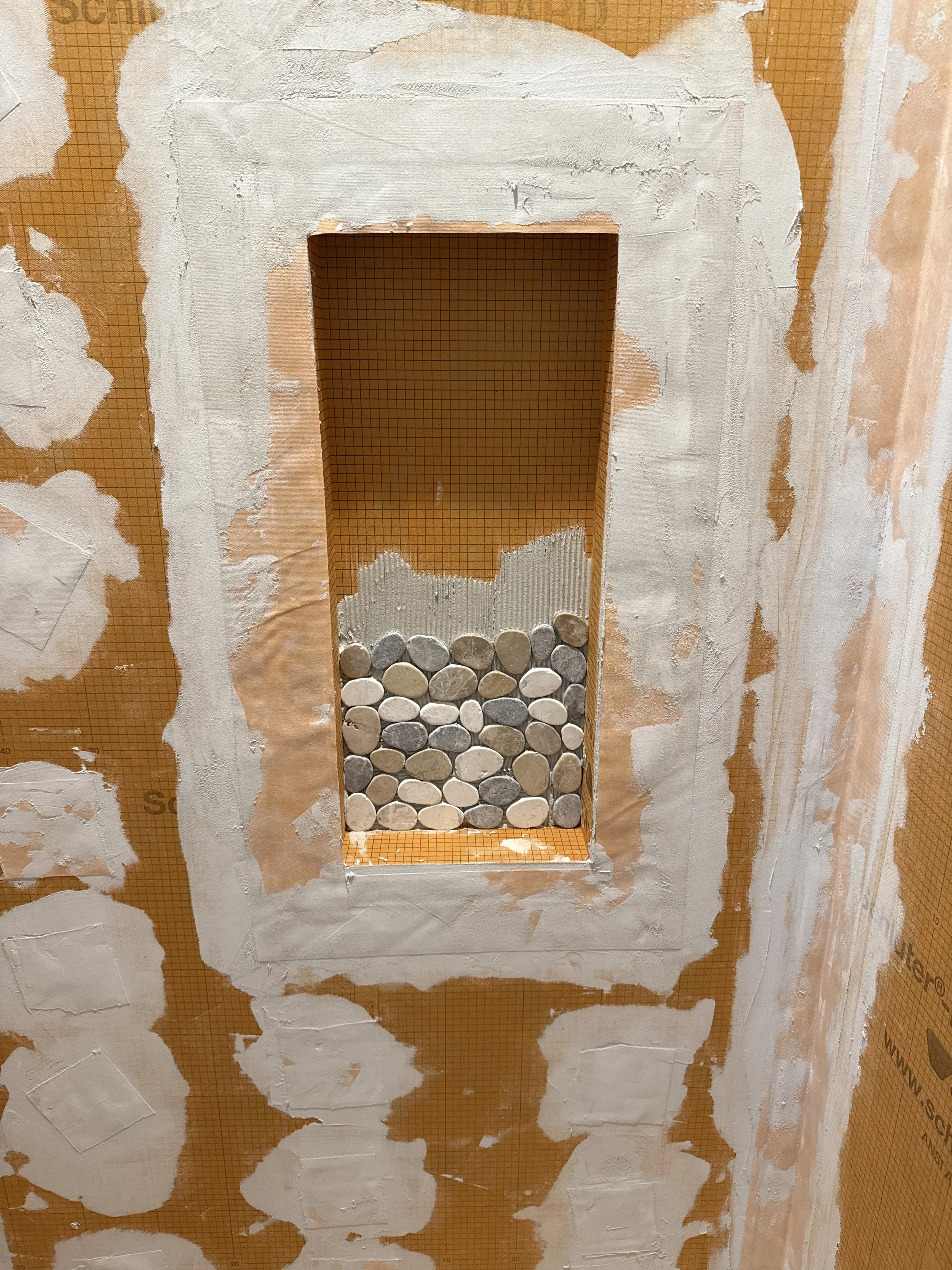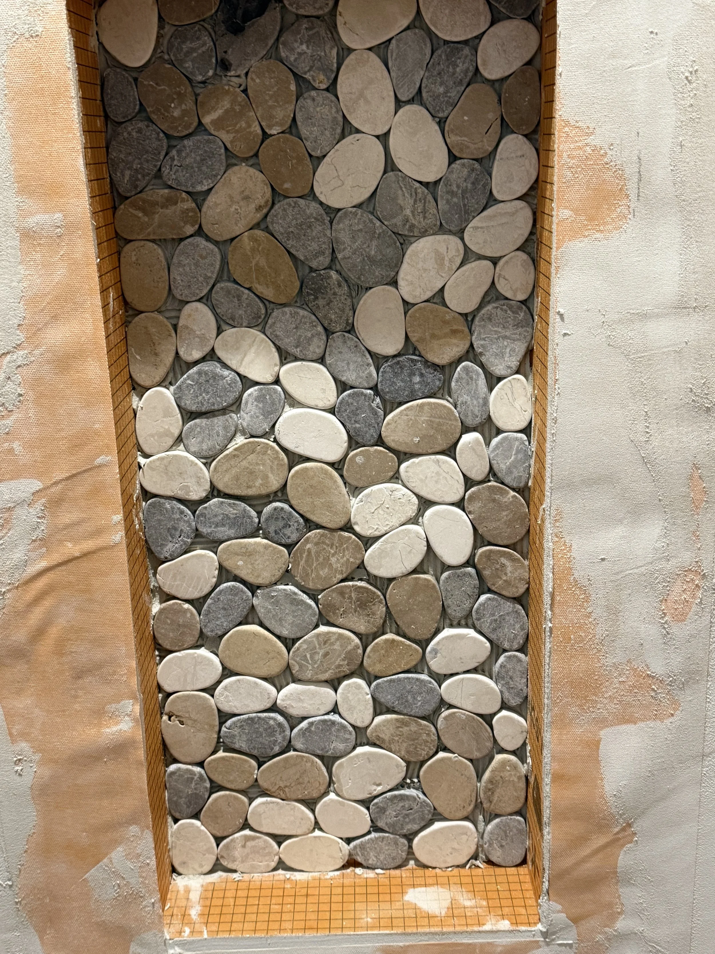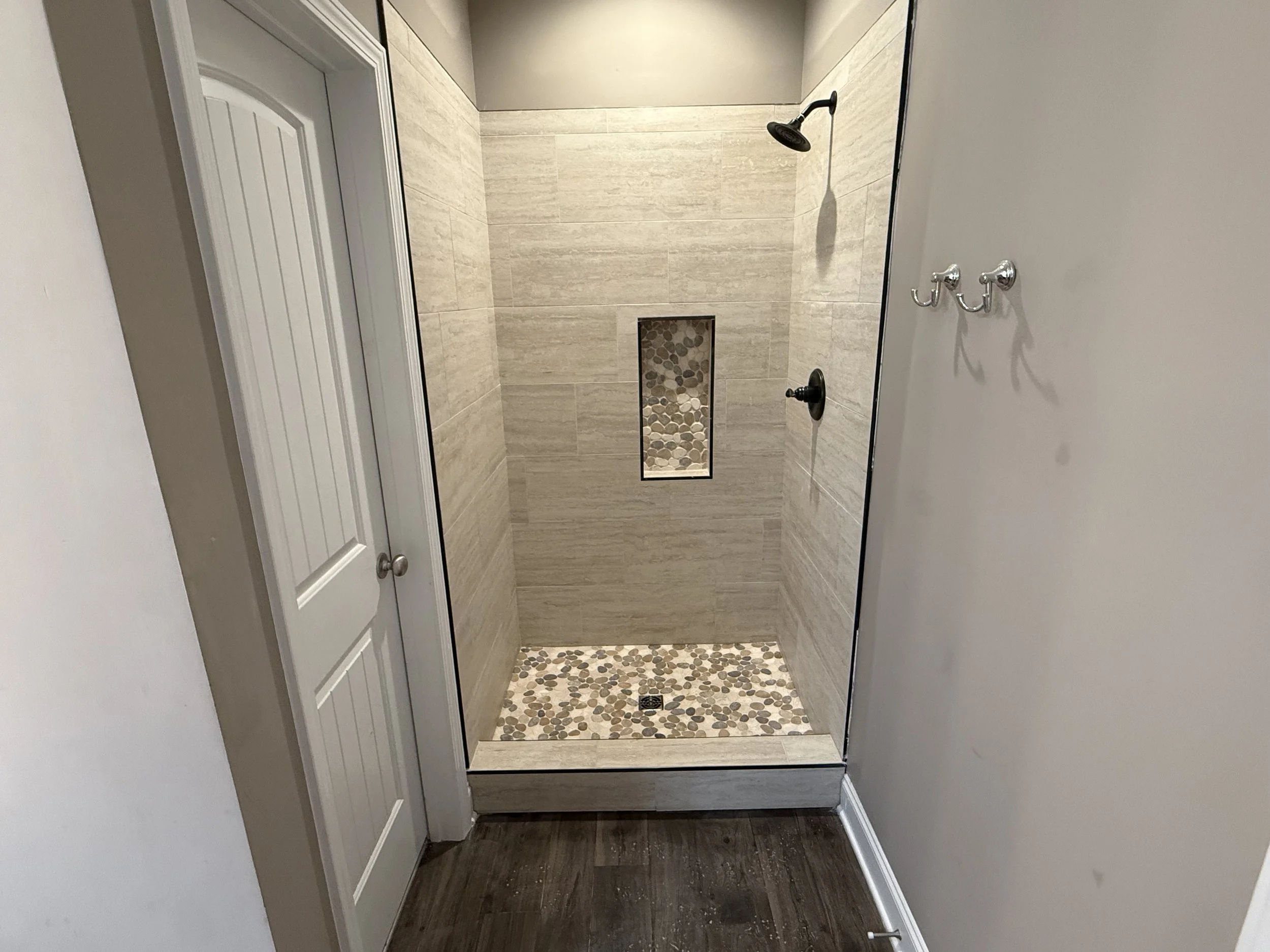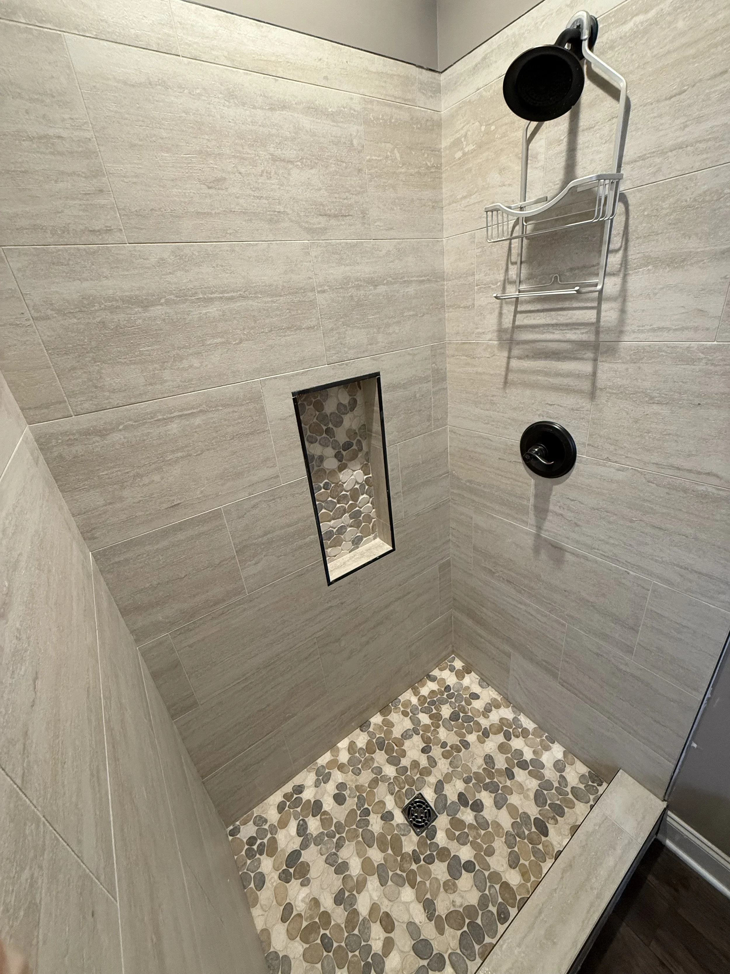 This shower transformation is all about natural beauty and durability. We installed a stunning pebble stone floor tile that brings texture, warmth, and a spa-like feel to the space. Paired with sleek, neutral wall tile and a coordinating niche accent, the result is both timeless and inviting. The combination of earthy tones and clean lines creates the perfect balance between modern design and natural elements, turning this shower into a true retreat.