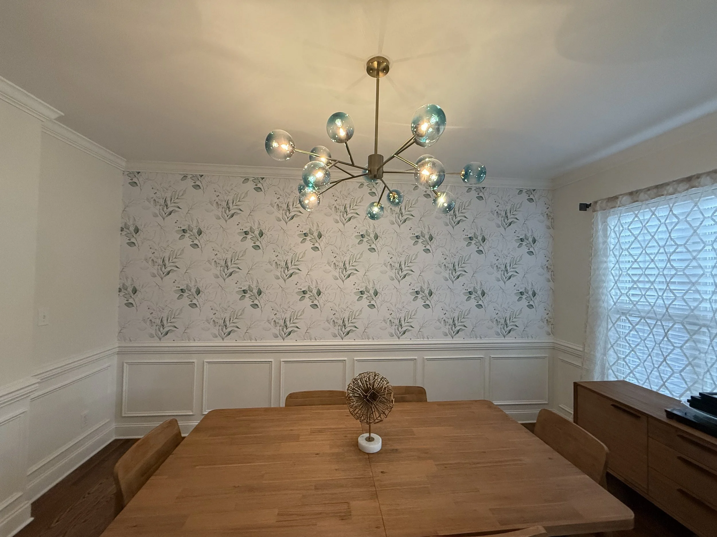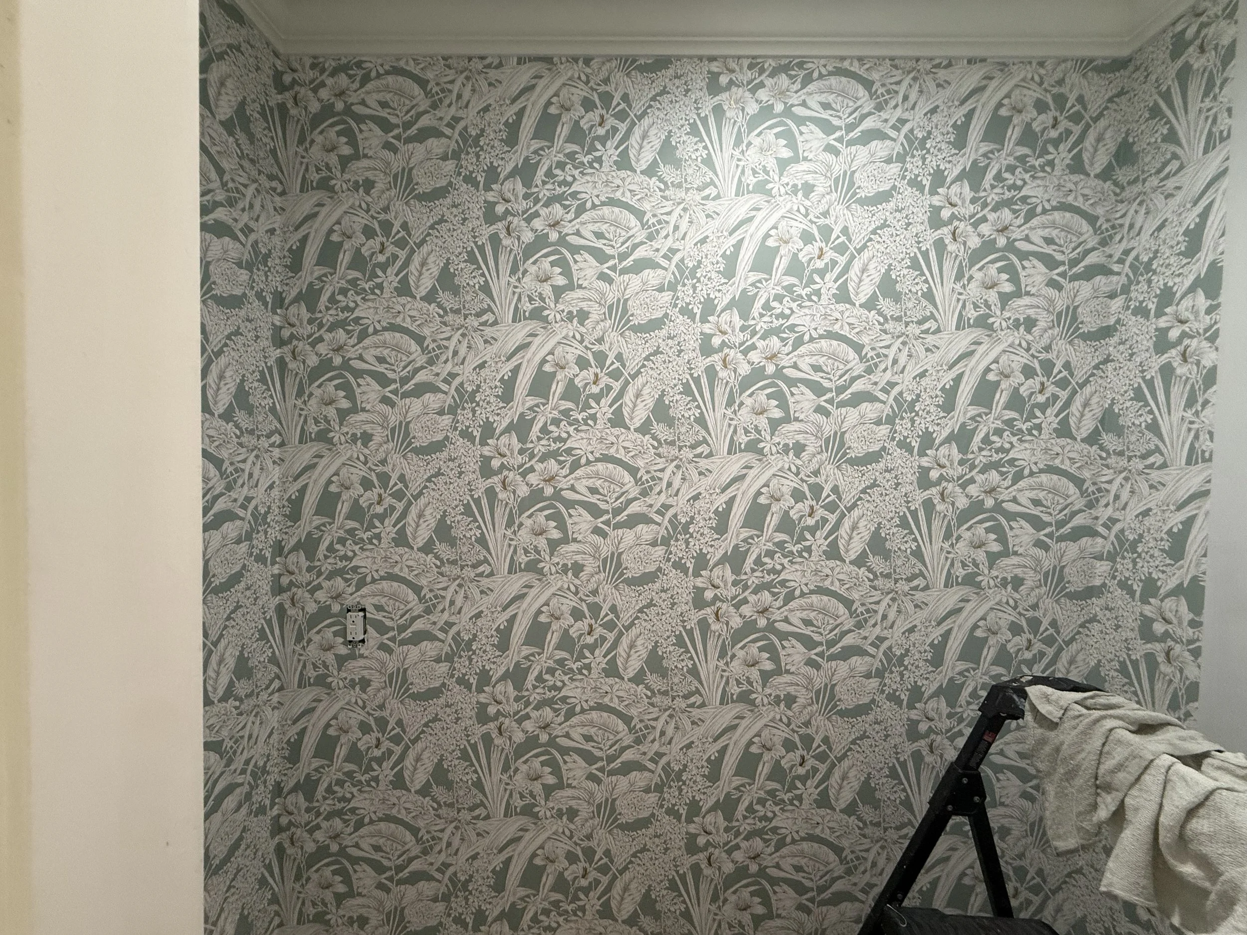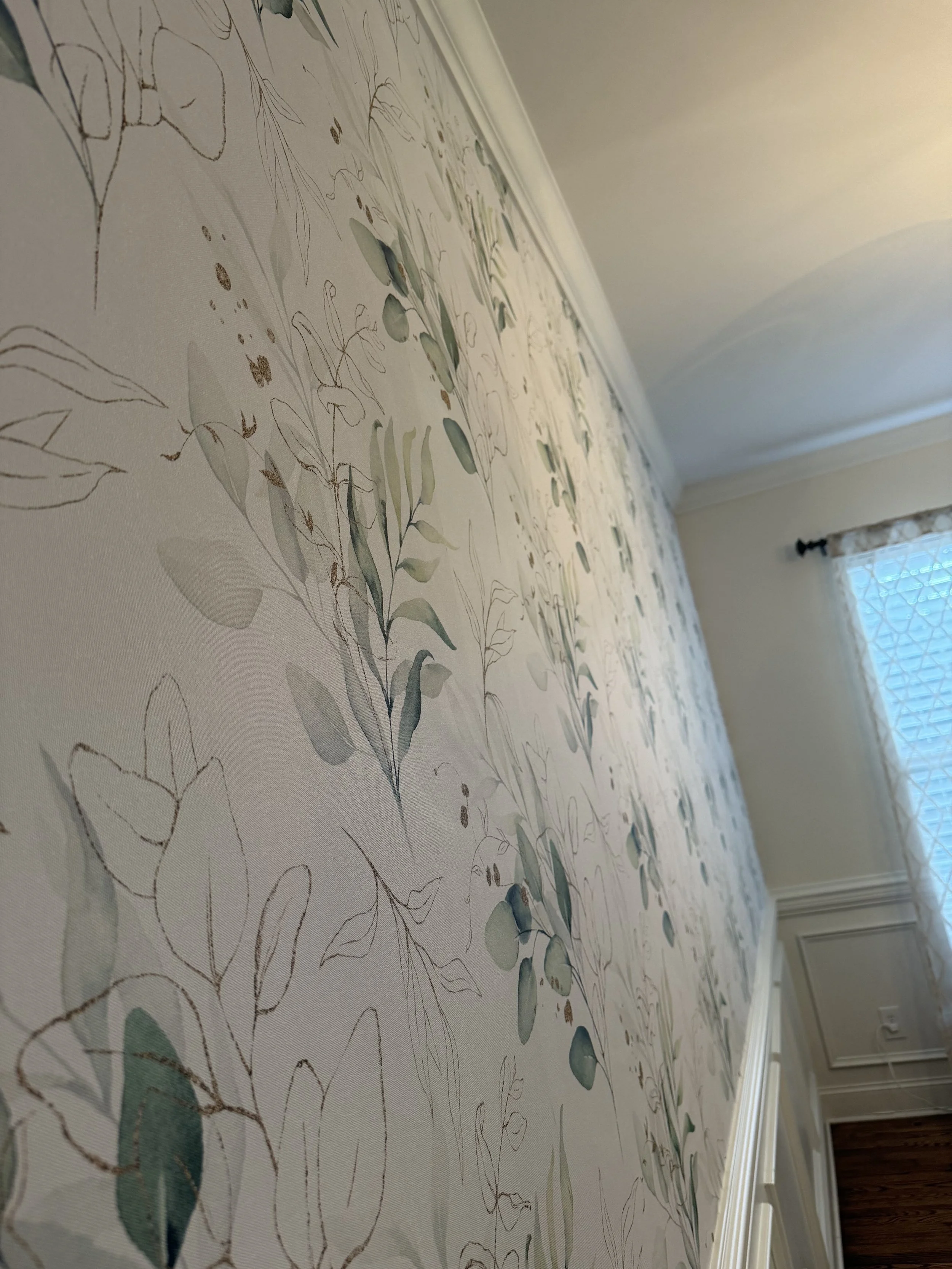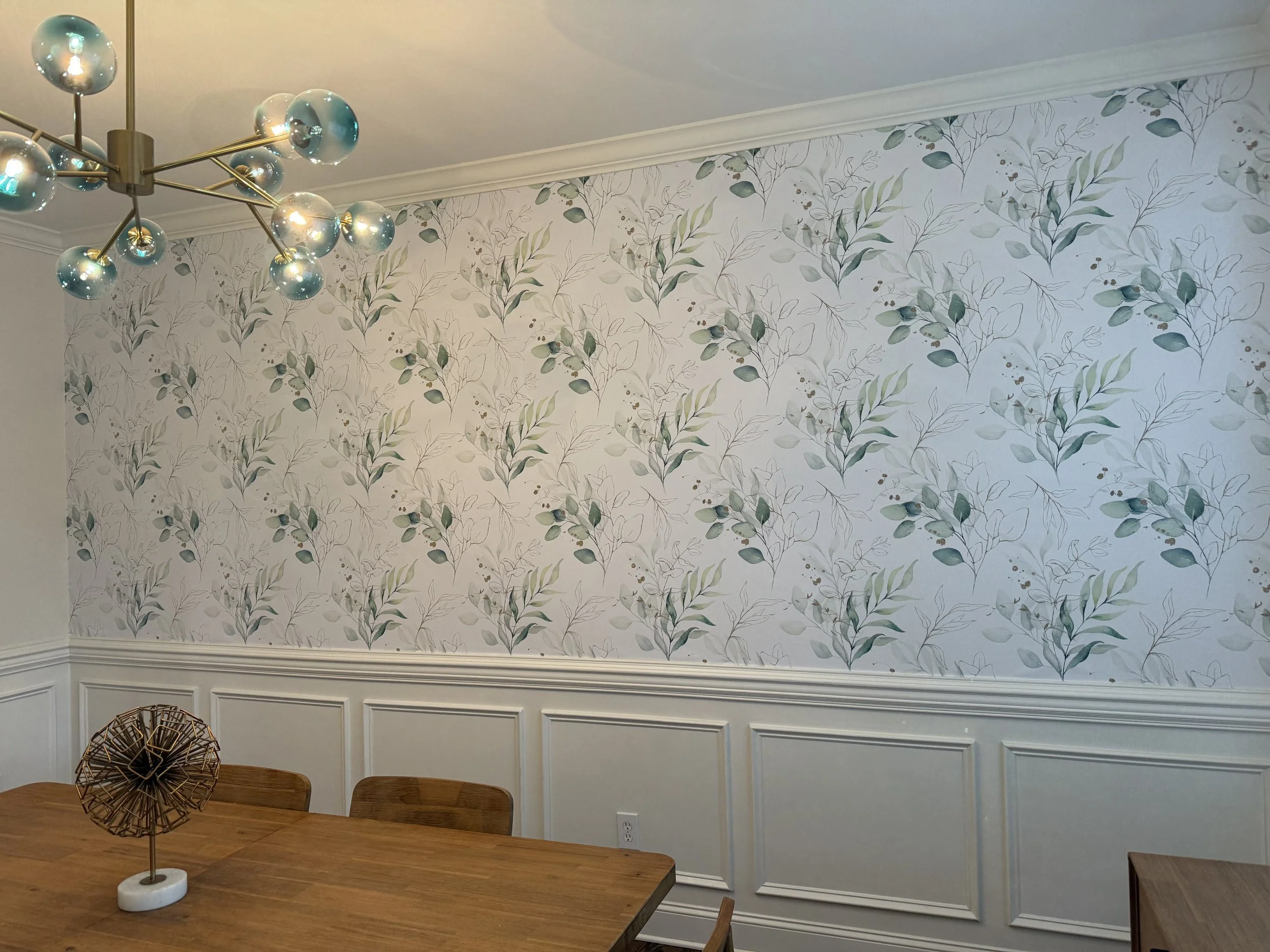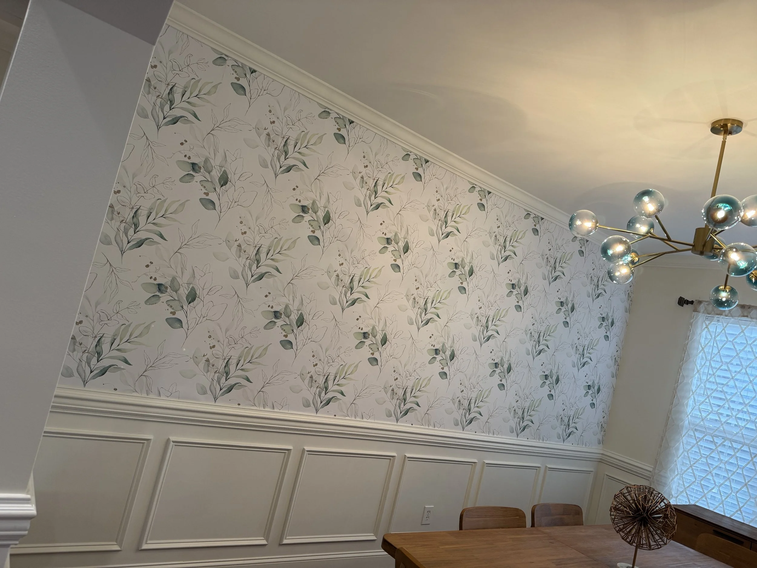 For this project, we installed wallpaper in the dining room, powder room, and laundry room to add personality and style throughout the home. The dining room was transformed with a soft floral feature wall paired beautifully with the existing wainscoting for a timeless and elegant look. In the powder room, a bold botanical print created a high-end statement in a smaller space, while the laundry room received a patterned accent wall that brought charm and character to a functional area. Each space was prepped and finished with precision, ensuring smooth seams, clean lines, and a polished result.