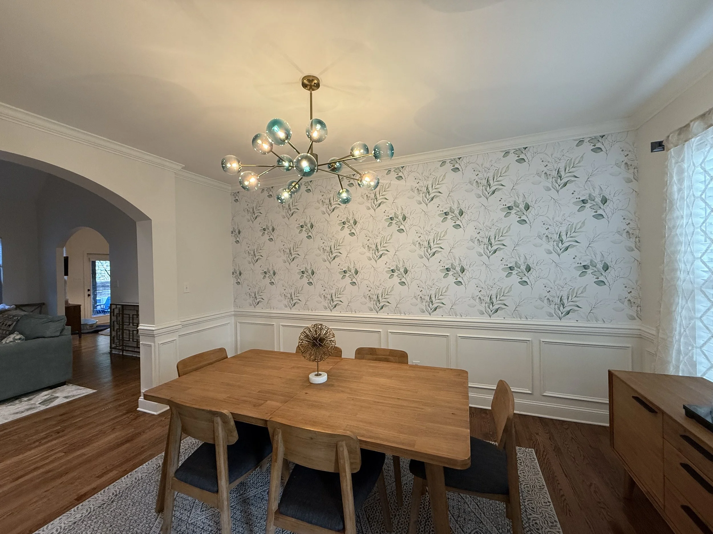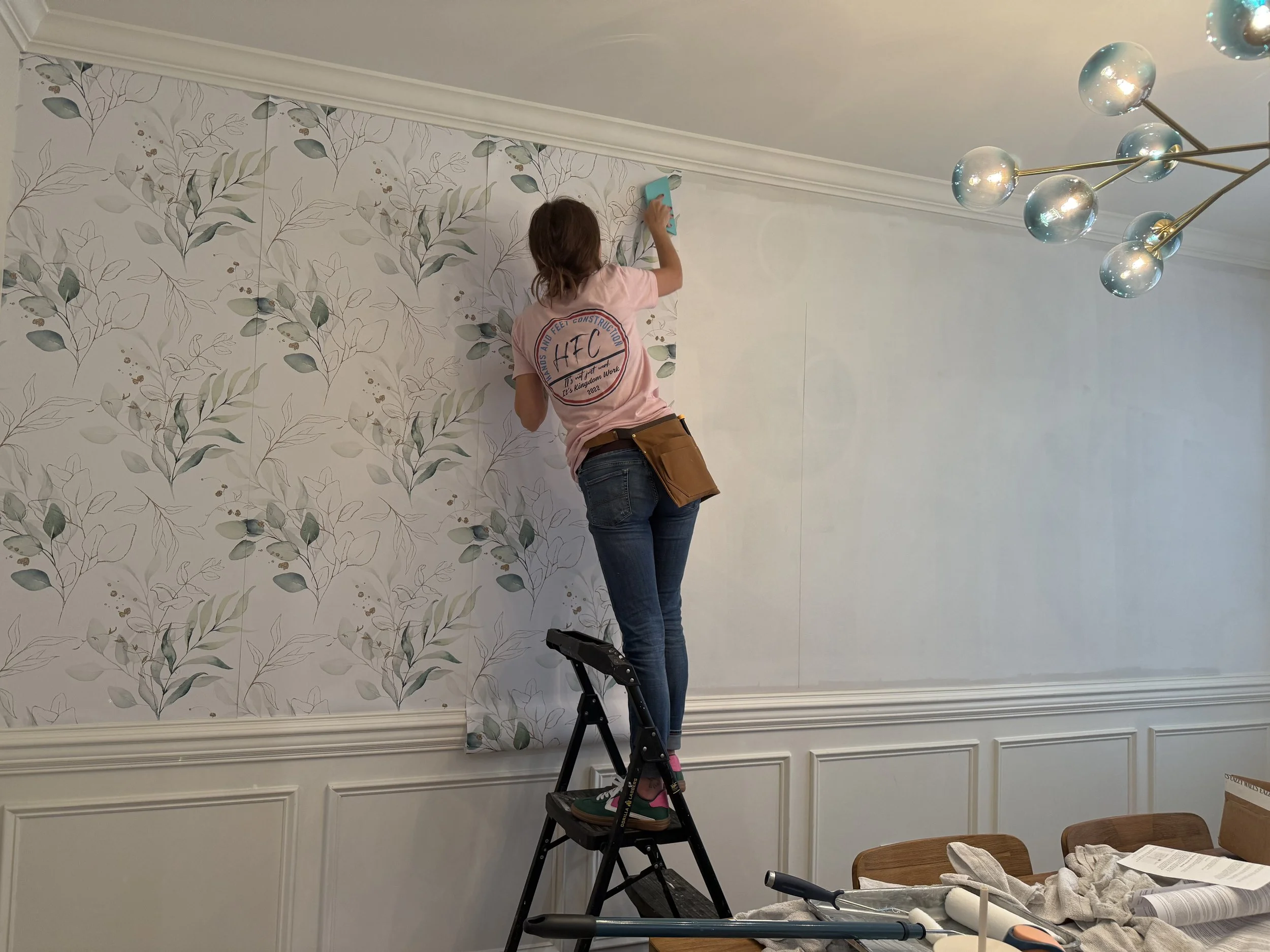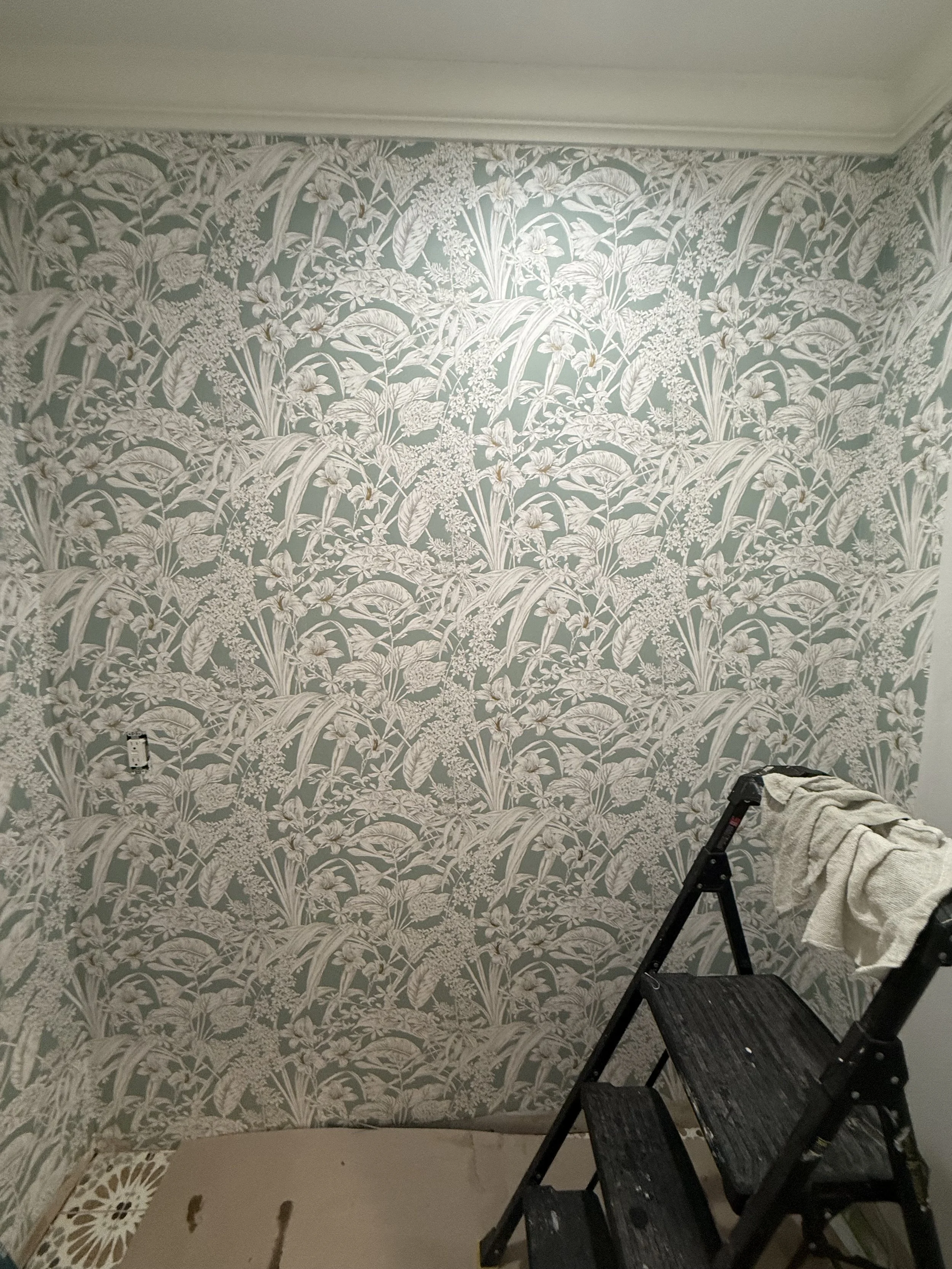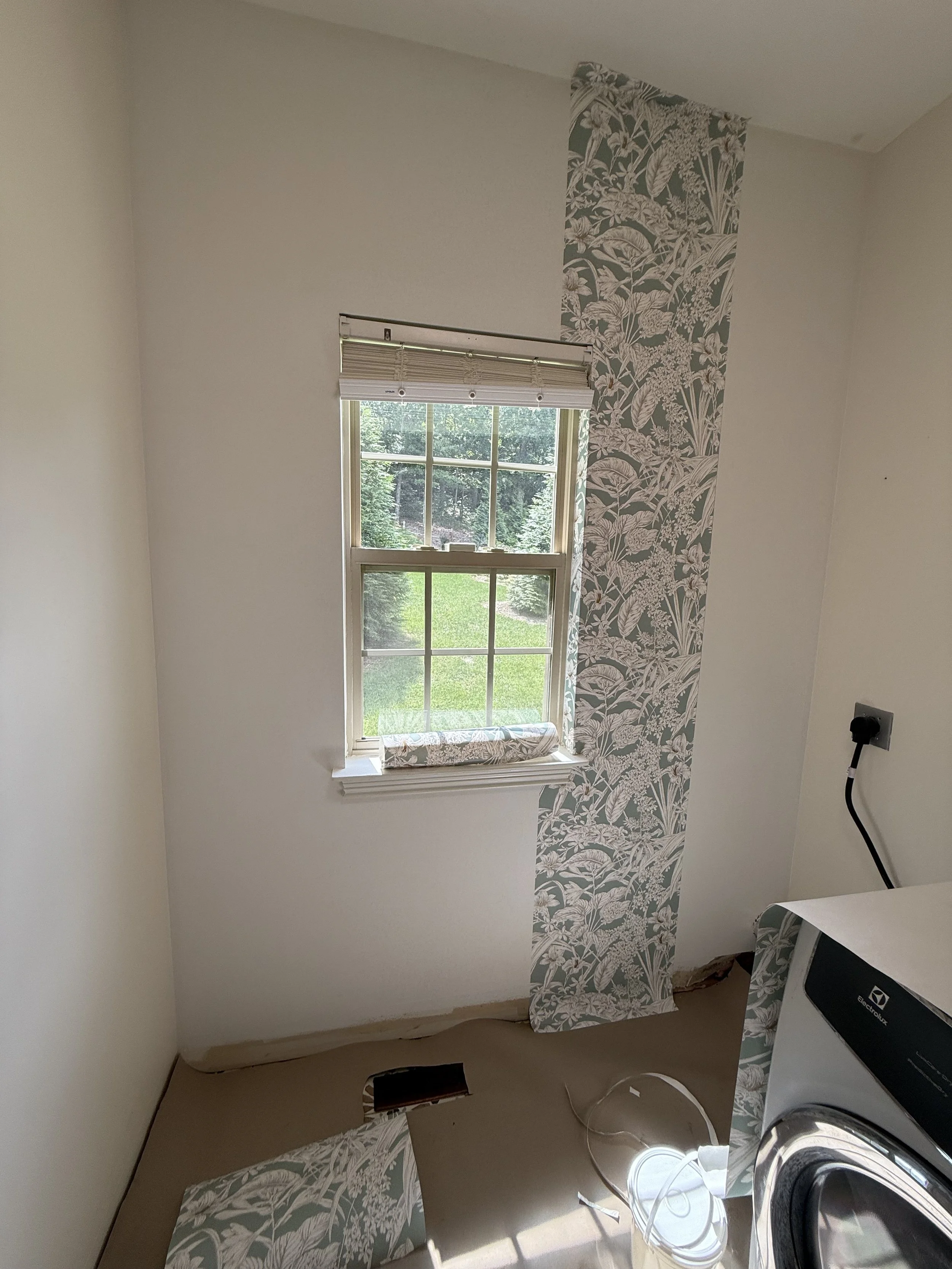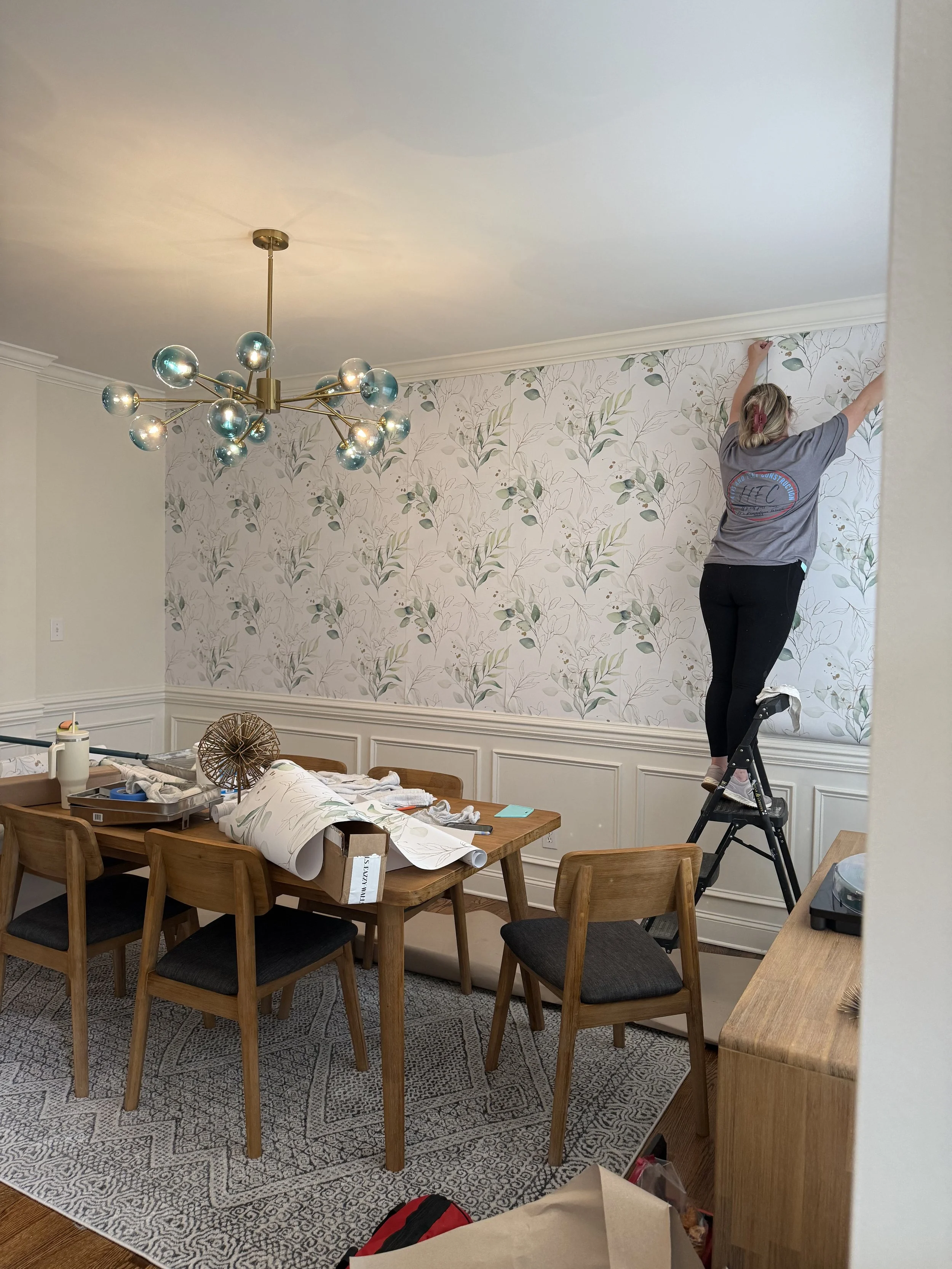 For this project, we installed wallpaper in the dining room, powder room, and laundry room to add personality and style throughout the home. The dining room was transformed with a soft floral feature wall paired beautifully with the existing wainscoting for a timeless and elegant look. In the powder room, a bold botanical print created a high-end statement in a smaller space, while the laundry room received a patterned accent wall that brought charm and character to a functional area. Each space was prepped and finished with precision, ensuring smooth seams, clean lines, and a polished result.